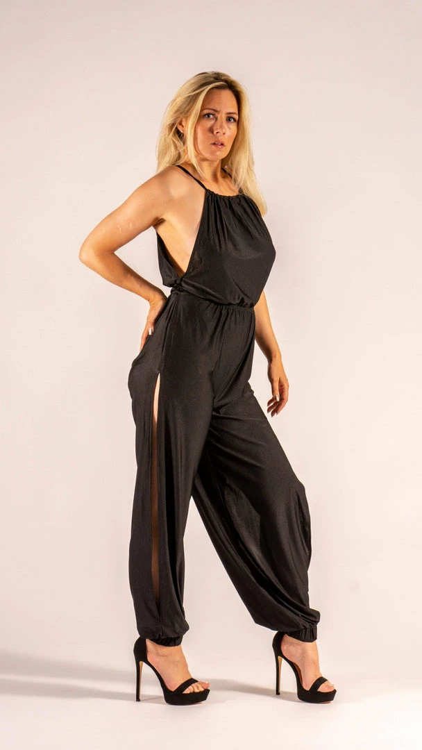 Looking for a show-stopping party outfit ? Dare to be bold with this slinky black jumpsuit, featuring a belt to flatter your waist + chic leg cut outs. Whether its a full glam occasion, or date night that’s calling – you’ll be turning heads, that’s for sure!Â