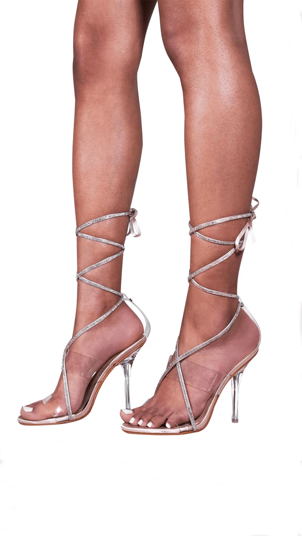 Add some luxe to your shoe-drobe with these weekend worthy champagne diamond heels. Complete with a perspex heel + leg lengthening tie up design – the perfect pair to steal all the stares !