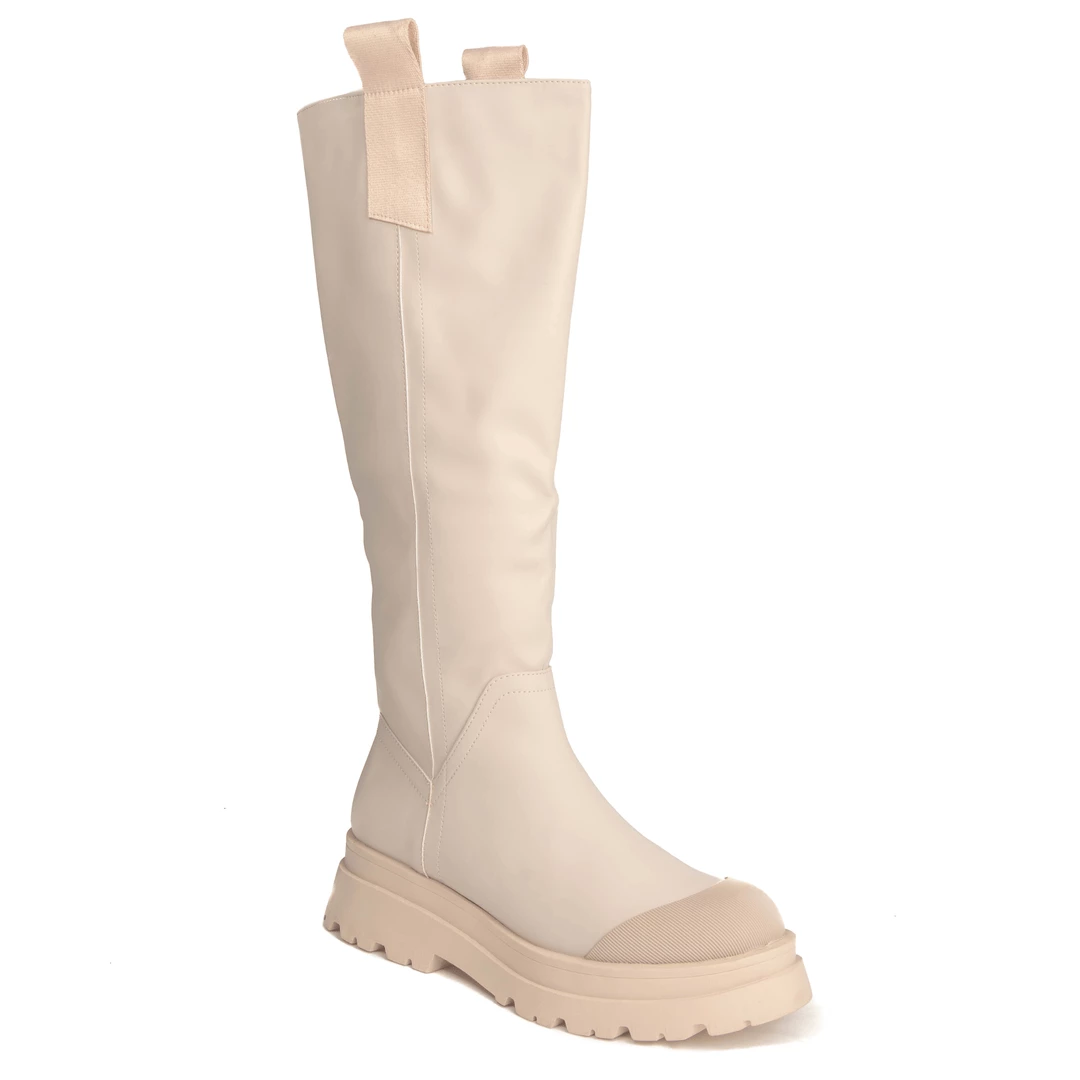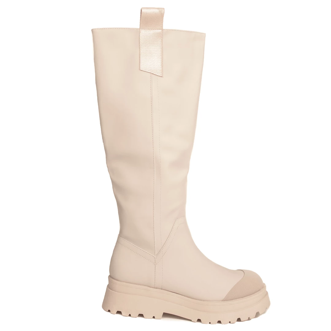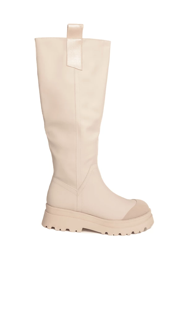 These Cream PU Chunky Tab Boots are a staple this season. Featuring an on-trend chunky sole + pull on wellie boot style.  Complete with leather look leggings + a chunky knit for a look we’re obsessed with !