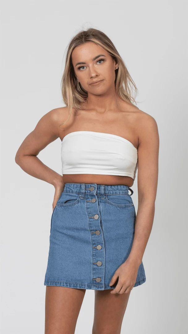 Our denim mini skirt is a wardrobe essential that you’ll reach for time + time again – saving you from of those dreaded ‘I have nothing to wear’ days. Pair with a graphic T-shirt to add some grunge to your ‘fit or partner with some strappy heels + a black crop for a classic look that’s sure to turn heads !