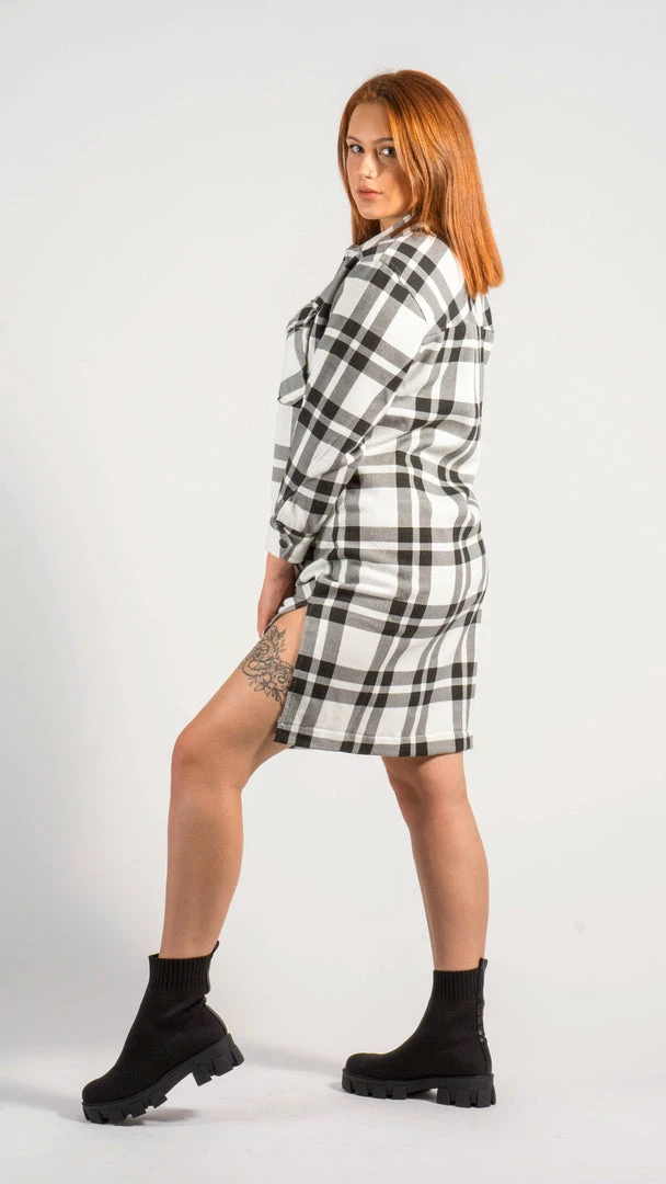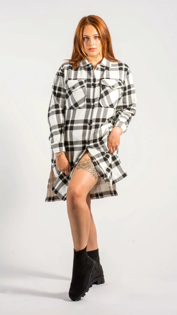 Step out in style this season in our oversized black & white check fleece dress, a thick cosy fabric that will have you slaying this winter in style. Pair with chunky boots, your favourite tights or it can also double up as a shacket depending on your look… multifunctional & warm !