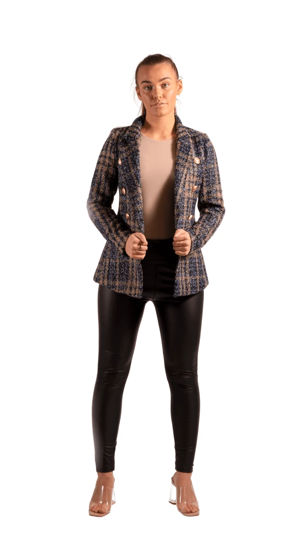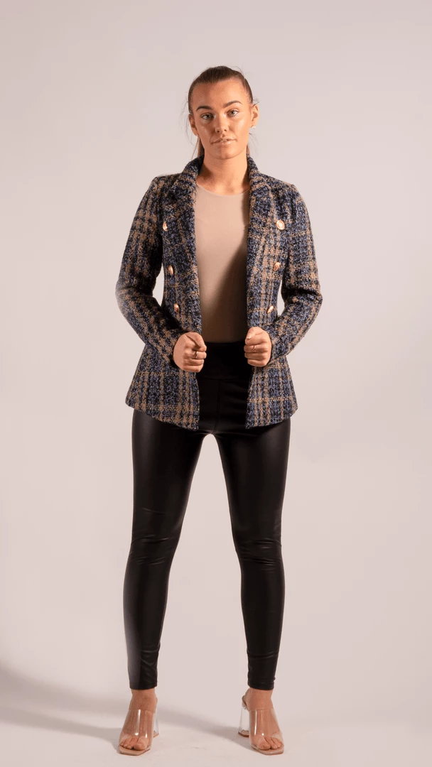 Add a touch of tailoring to your winter wardrobe with our camel + navy check blazer. A classic piece that is timeless. Â Finished with gold button detailing, layer on top of any outfit for added luxe – taking office chic to the streets !