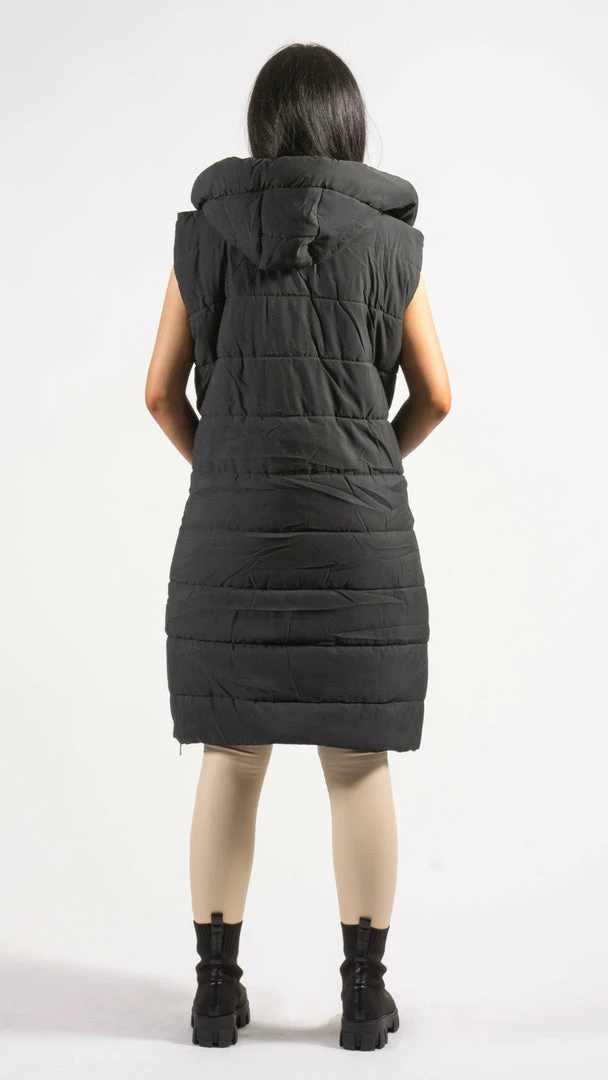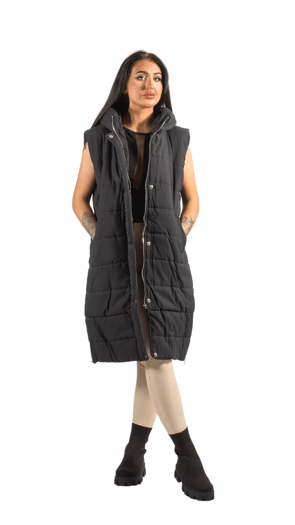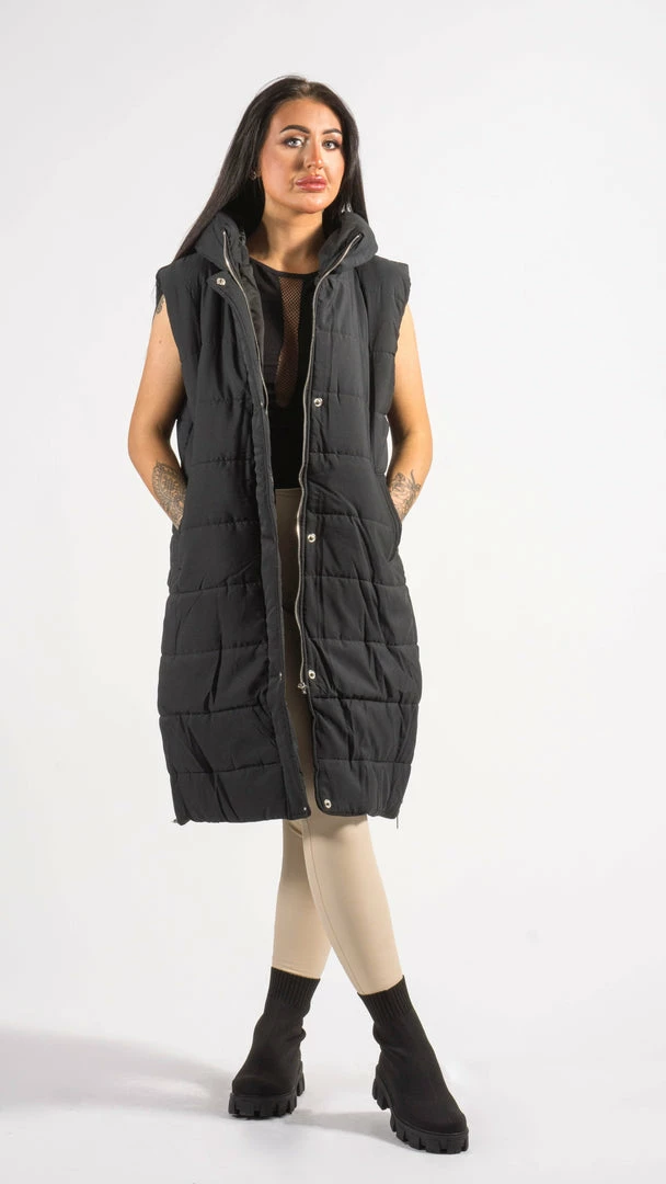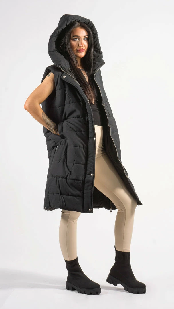 Want to look glam this winter and stay warm ? This gorgeous longline black gilet comes complete with a cosy hood, perfectly paired with some wet look leggings and chunky flats!