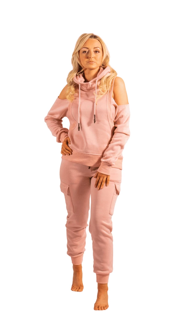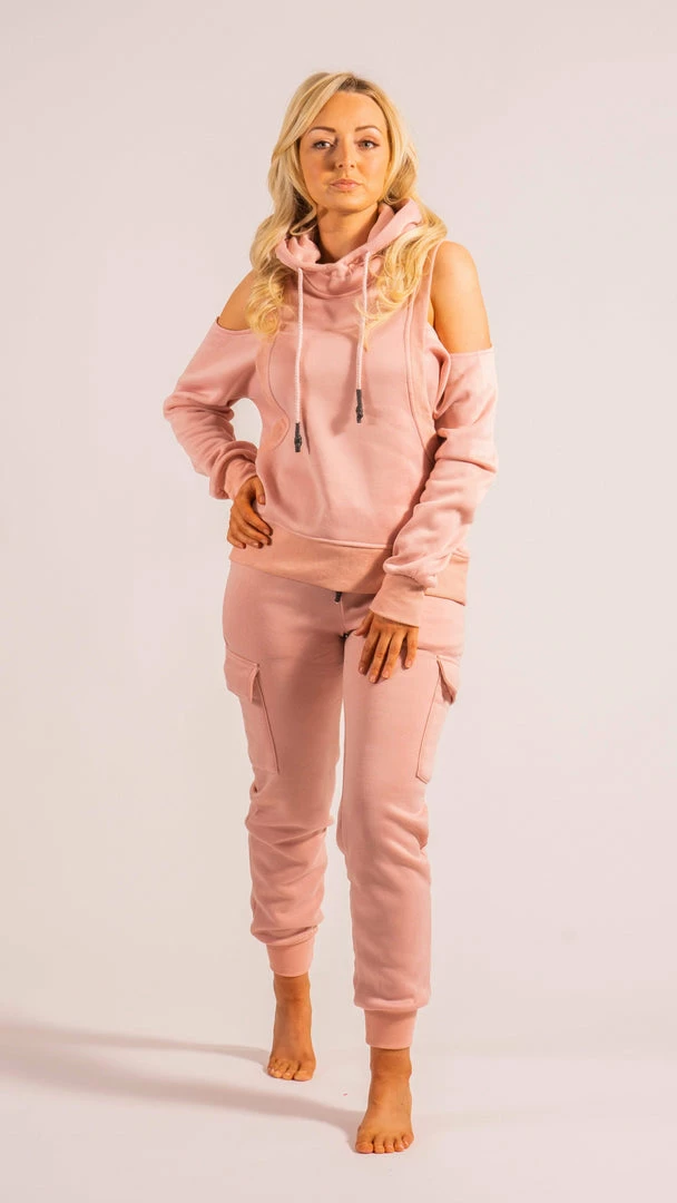 Whether its autumn, winter or spring we all need our go to jogger set for chilled weekends or lazy days off – this pink cut out shoulder detailed hoodie with matching jogger pants with a side pocket is your new gym bag or weekend essential !