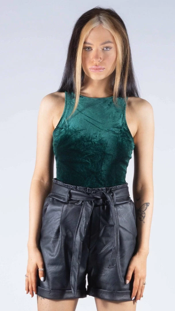 Take your weekend wardrobe from drab to fab with this Green Velvet Bodysuit. A figure flattering party season must-have, complete the look with some high waisted PU shorts + statement earrings – you’ll be the belle of the ball for sure !