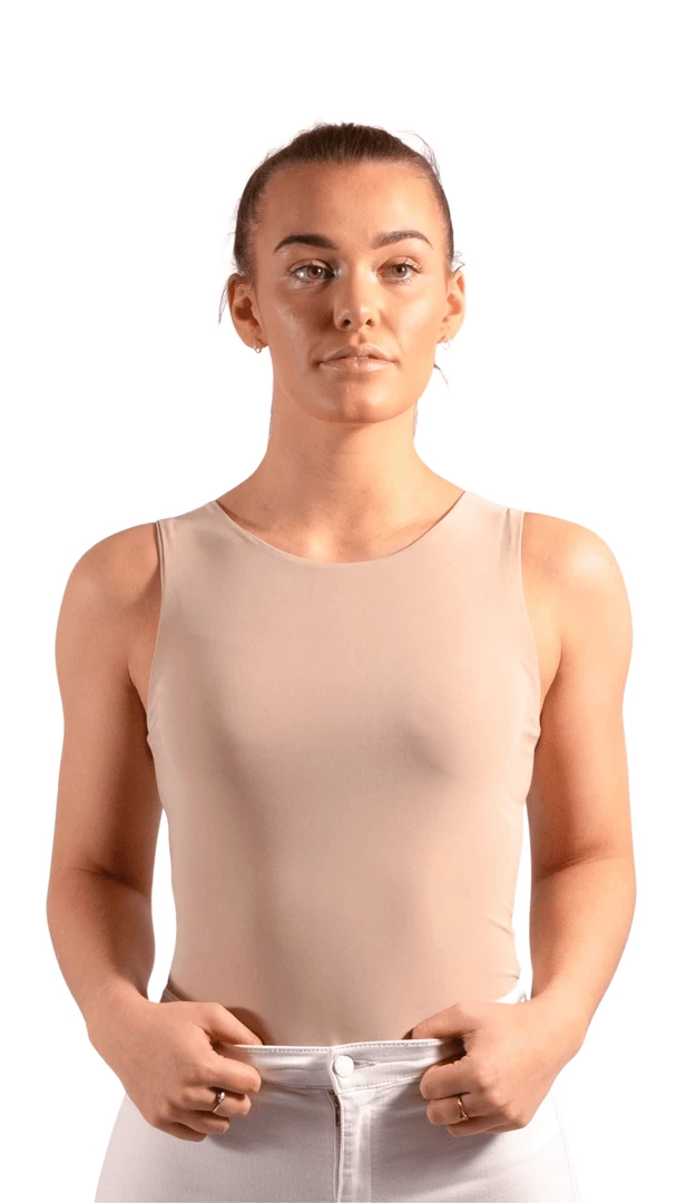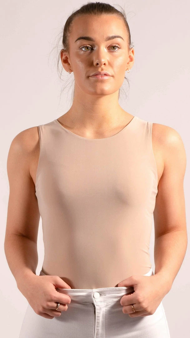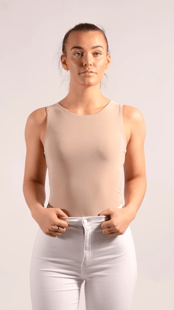 A wardrobe essential – a neutral stone slinky bodysuit is a staple you will wear over + over again. Pair with jeans + a check shacket for everyday style or with barely there heels + leather shorts for evening glam !