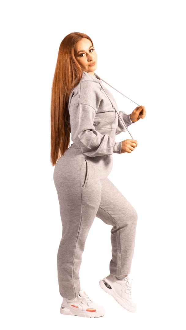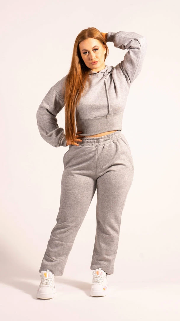 This grey tracksuit jogger with cropped style hoodie is a two piece set.  The unique balloon sleeve detail and super soft fabric with drawstring on the top and bottom ensures you look good even on your most chill days!
