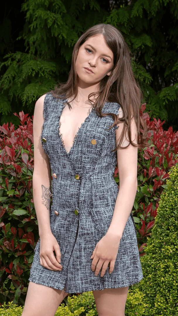 Suit up + look chic in this grey double breasted dress from St Genies. Complete with a mini cut to lengthen your legs ! Team with your fav heels for a look we’re loving.