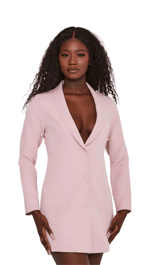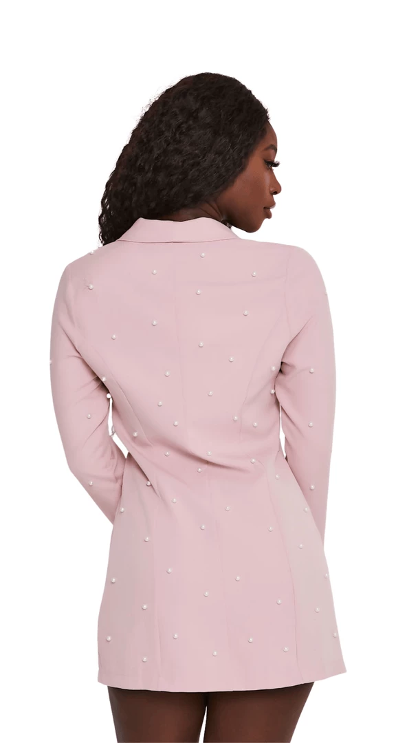 A beautiful pink tailored blazer dress with a deep v front, emblazoned with pretty pearls, finished with a styled lapel to add a little chic to your week !